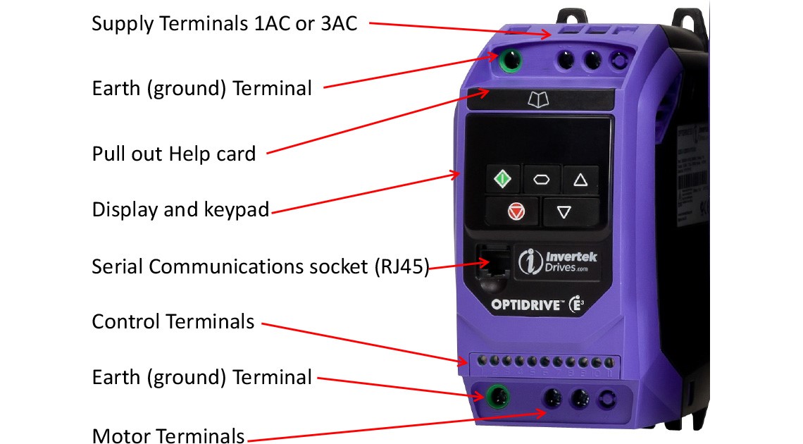 Instalar un variador de frecuencia es bastante sencillo, pero ten en cuenta que debe mantenerse fresco. Esto significa que debe haber un buen flujo de aire alrededor del VFD, y que las recomendaciones del fabricante (¡lee el manual de instrucciones!) sobre el espaciado alrededor de la unidad deben seguirse (¡lee el manual de instrucciones!). ¡No bloquees el flujo de aire con el troncal de cable! Asegúrate de que el suministro de aire esté limpio y libre de polvo, suciedad, fluidos, etc. La Figura 1 muestra la ubicación de las piezas clave en una unidad IP20 E3. Las unidades IP66, por supuesto, tienen terminales cerrados, y los discos de alimentación más grandes tienen los terminales en la parte inferior.
