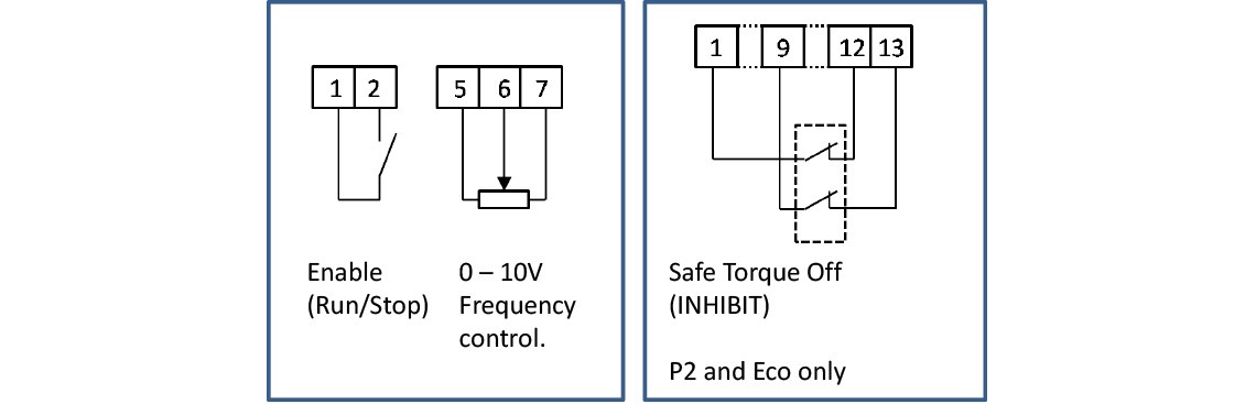 En unidades como las P2 y Eco (pero no E3) se requieren conexiones adicionales (por ejemplo, enlaces) desde los terminales Safe Torque Off a los terminales de 0V y 24V. Si no lo has hecho, la pantalla mostrará INHIBIT.